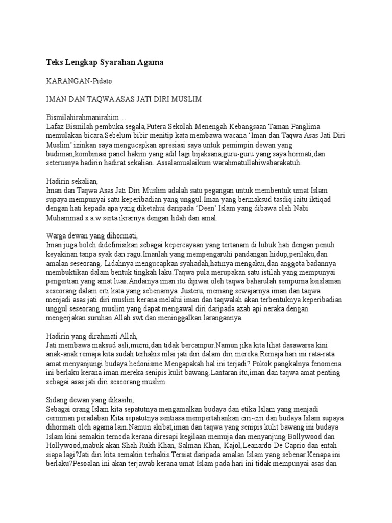 Ini catatan teks pidato. IMAN DAN TAQWA ASAS JATI DIRI MUSLIM. 19062022 Teks syarahan agama bahasa melayu sekolah menengah.